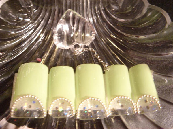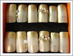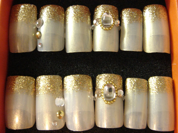 | サイズはS、M、Lお選びいただけます。 | ラメの色はゴールド、シルバー、ピンク、ブルーがあります。10枚1組です。 | 結婚式用にベースを白にもできます。 | クリアチップがベースになります。 |